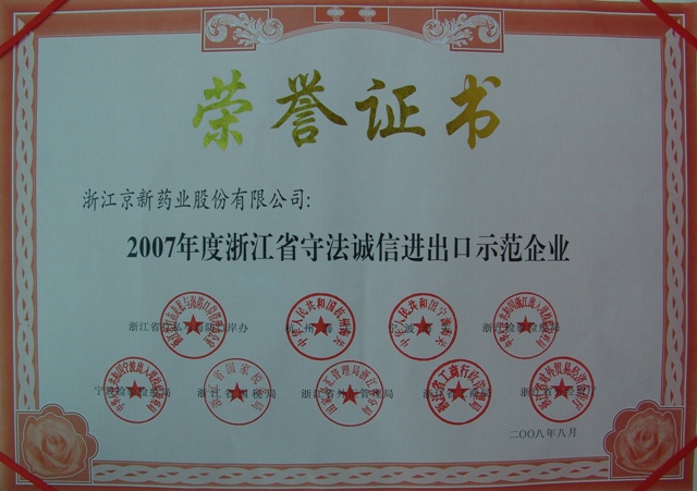 公司喜获2007年度浙江省遵法诚信收支口树模企业