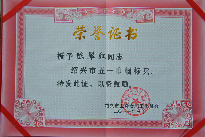 日前获悉,,,,,,,,药品制造公司库管科科长陈翠红获得了“绍兴市五一巾帼尖兵”的声誉称呼,,,,,,,,这是对陈翠红恒久在客栈管理这一通俗的岗位上作出了欠亨俗效果的最好一定。。。。。。