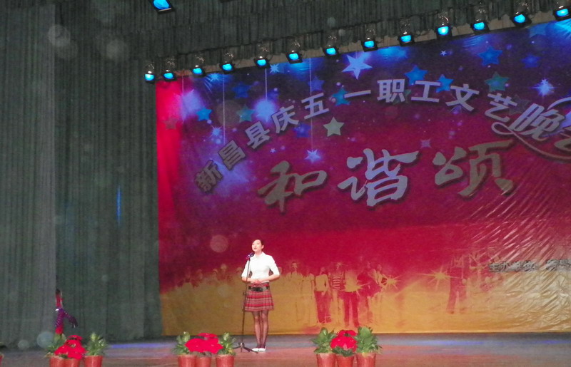 4月28日晚7点,,,,,,,,由县总工会举行的新昌县“协调颂”庆五一职工文艺晚会暨表扬大会在县文化中心盛大举行。。。。。。县向导潘岳梦、严钢出席晚会,,,,,,,,包括我公司在内的县内十多个大型企业加入了文艺演出,,,,,,,,精彩的演出为劳动者的节日带来了欢喜。。。。。。我公司选送的节目诗朗诵《走进新宝gg创造奇迹》,,,,,,,,由研究一所王艳丽演出,,,,,,,,她以新进职工的角度抒发了对公司的热爱之情。。。。。。