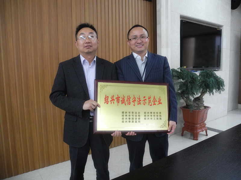 公司一直坚持忠实守信,,,,,,依法谋划原则,,,,,,经绍兴市普法办、绍兴市经信委、绍兴市司法局、绍兴市环保局、绍兴市国资委、绍兴市工商局、绍兴市质监局等7家部分团结评审,,,,,,2013年11月被评定为绍兴市“诚信遵法树模企业”。。。。。。。